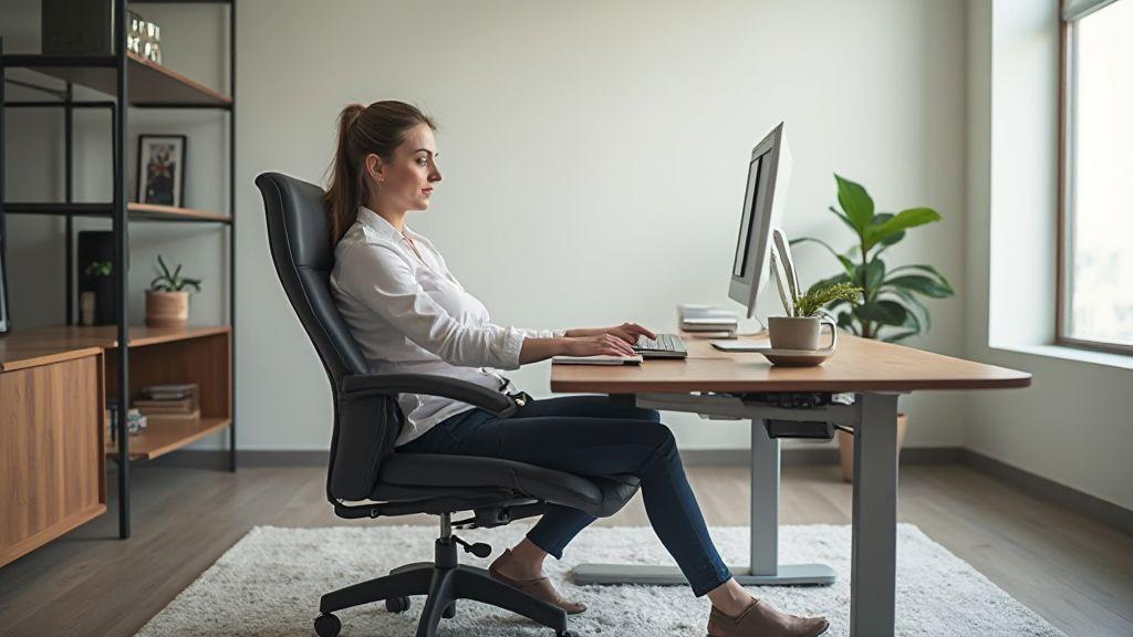 Profundidade do assento correta (2–3 dedos), pés apoiados, suporte lombar firme. Inclinar levemente o encosto e alternar postura a cada 30–45 minutos reduz pressão nos discos.